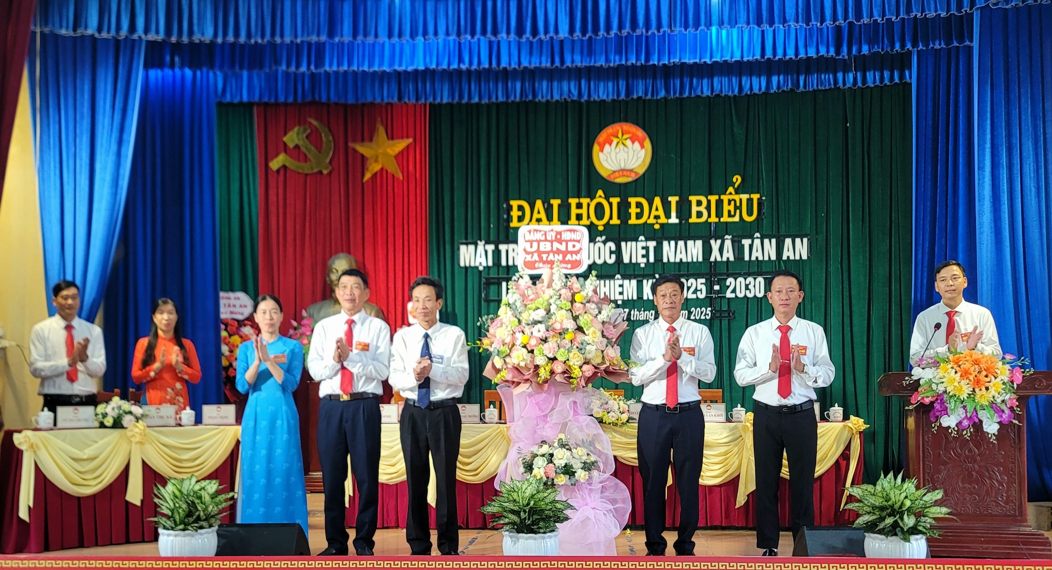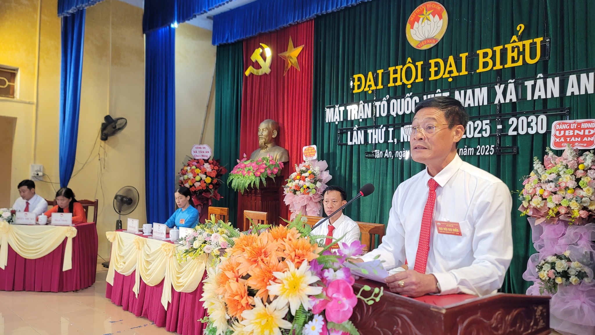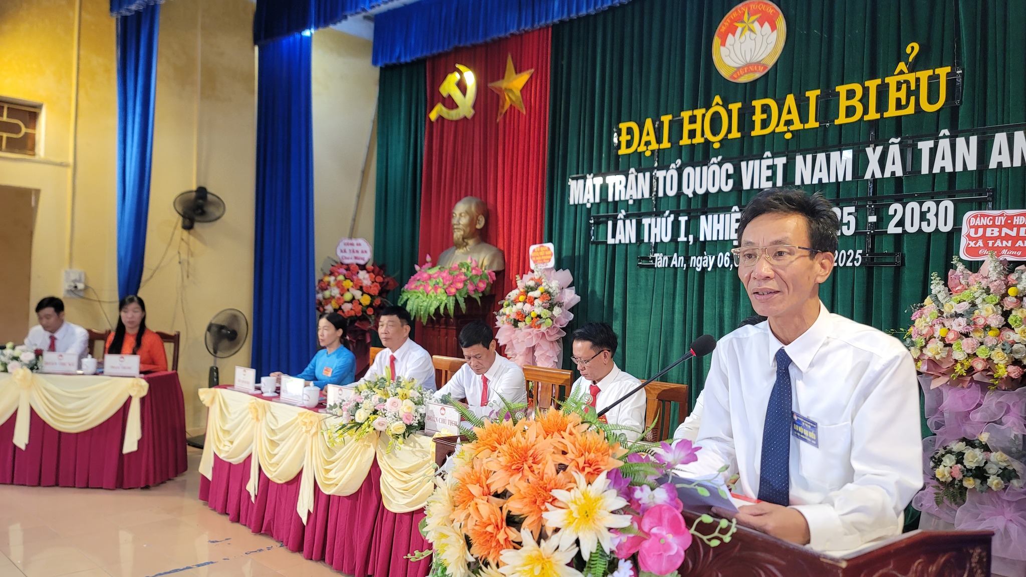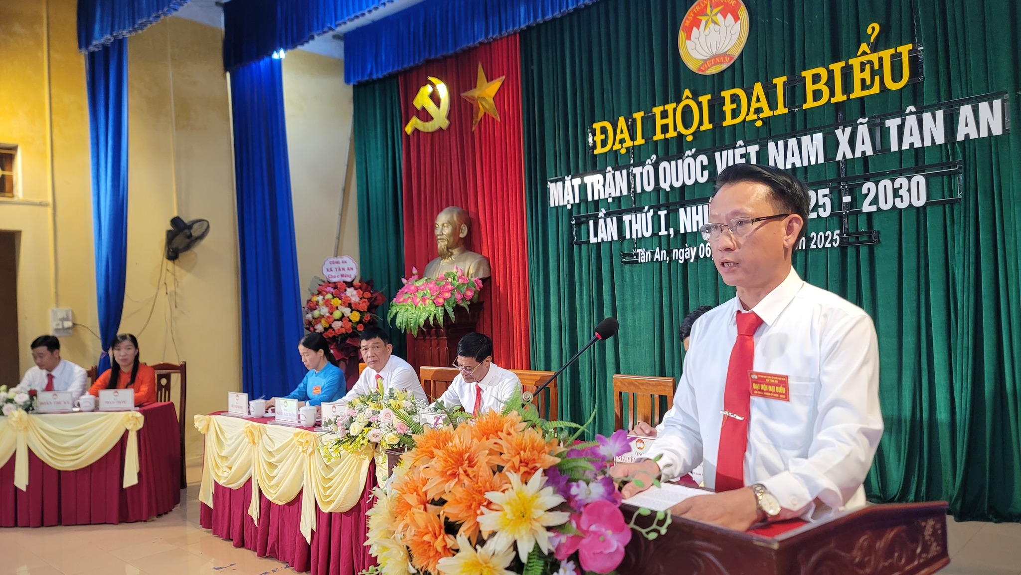 Ông: Nguyễn Gia Bảng - Bí thư Đảng ủy, Chủ tịch HĐND xã Tân AnPhát biểu tại đại hội, ông Nguyễn Gia Bảng - Bí thư Đảng ủy, Chủ tịch HĐND xã Tân An đã ghi nhận những kết quả đạt được của Ủy ban MTTQ Việt Nam xã trong nhiệm kỳ vừa qua. Những kết quả đạt được đã khẳng định vai trò nòng cốt chính trị, là trung tâm của khối đại đoàn kết toàn dân tộc. Đây là nền tảng quan trọng để Mặt trận xã tiếp tục đổi mới, hoàn thành thắng lợi các nhiệm vụ trong giai đoạn mới. Tại Đại hội ông Bí thư Đảng ủy xã đưa ra 6 nhiệm vụ trọng tâm: Ủy ban MTTQ Việt Nam xã nhiệm kỳ mới sẽ tiếp tục phát huy khối sức mạnh đại đoàn kết toàn dân tộc trên địa bàn với quyết tâm cao, hành động lớn để thực hiện thắng lợi các nhiệm vụ chính trị được giao. Đẩy mạnh công tác tuyền, vận động nhân dân tham gia các phong trào thi đua yêu nước; đổi mới nội dung, phương thức hoạt động của MTTQ Việt Nam xã và các tổ chức chính trị - xã hội theo hướng toàn dân, toàn diện, có trọng tâm, trọng điểm, phù hợp với thực tiễn; đẩy mạnh ứng dụng công nghệ thông tin, chuyển đổi số trong cộng đồng dân cư; phát huy tính chủ động, tự quản của cộng đồng dân cư; nâng cao thực hiện dân chủ ở cơ sở…