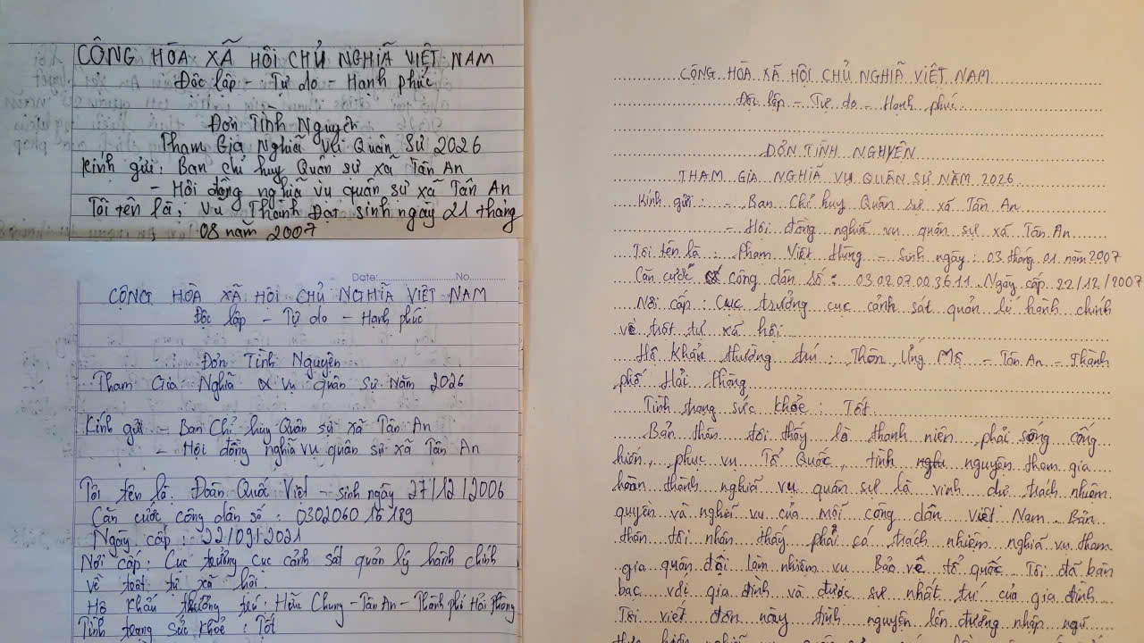 Để chuẩn bị tốt cho đợt sơ tuyển, khám tuyển cũng như tuyển quân năm 2026, Hội đồng nghĩa vụ quân sự xã Tân An đã đẩy mạnh tuyên truyền tới các đoàn viên thanh niên trong độ tuổi sẵn sàng tham gia sơ tuyển, khám tuyển nghĩa vụ quân sự. Đến thời điểm này, mặc dù chưa bước vào sơ tuyển, nhưng đã có nhiều đoàn viên, thanh niên viết đơn tình nguyện nhập ngũ gửi về Ban CHQS xã Tân An. Tiêu biểu như đoàn viên Vũ Thành Đạt - thôn 4; Đoàn Nguyên Vũ, Đoàn Quốc Việt - thôn Hữu Chung; Phạm Việt Hùng - thôn Ứng Mộ; Nguyễn Đình Sơn - thôn Vân Cầu… Hầu hết các thanh niên viết đơn tình nguyện đều sinh năm 2007; những lá đơn tiên phong, tình nguyện xin nhập ngũ mang theo tinh thần trách nhiệm, tiếp nối truyền thống cha anh đóng góp một phần công sức trong xây dựng và bảo vệ Tổ quốc.