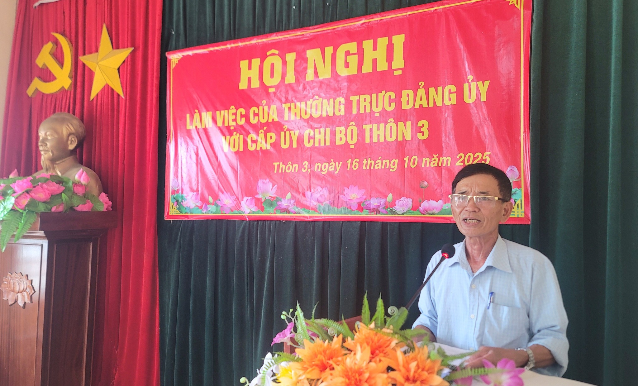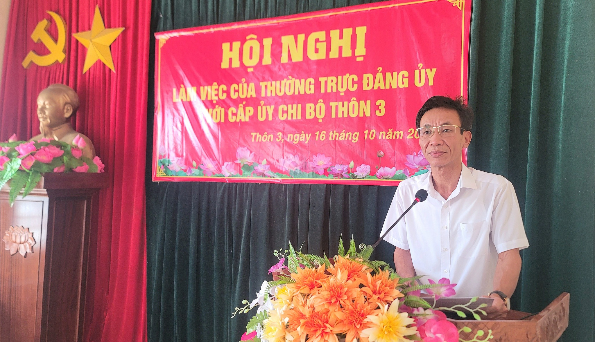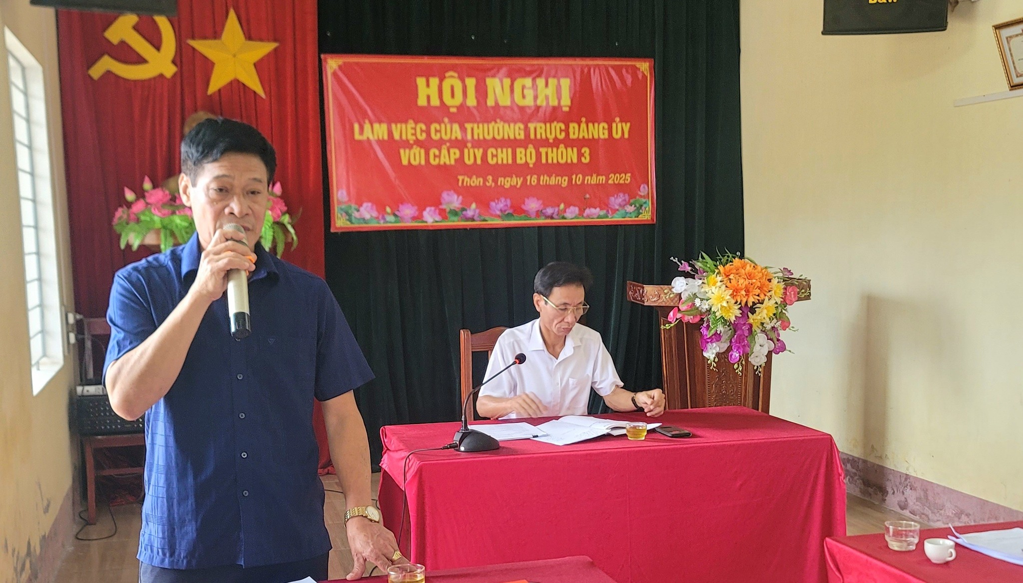 Đồng chí: Trần Quang Cao - Phó Bí thư Thường trực Đảng ủy phát biểu tại buổi làm việcThôn 3 hiện có 67,5 ha đất canh tác, 11,3 ha nuôi trồng thủy sản, trong sản xuất Nhân dân đã tích cực chuyển đổi cơ cấu cây trồng, vật nuôi gắn với áp dụng tiến bộ khoa học kỹ thuật góp phần nâng cao năng suất, chất lượng và hiệu quả kinh tế. Phong trào thi đua xây dựng nông thôn mới được cán bộ, đảng viên và Nhân dân hưởng ứng tích cực. Đến nay 21/21 tuyến đường làng với tổng chiều dài hơn 4,5 km đều được đổ bê tông. Các hoạt động văn hóa, văn nghệ, thể dục thể thao được đẩy mạnh, thôn hiện có 3 câu lạc bộ duy trì sinh hoạt thường xuyên, góp phần nâng cao đời sống tinh thần cho nhân dân. 100% học sinh trong độ tuổi đều đến trường, tỷ lệ gia đình văn hóa đạt 87%, 100% người dân tham gia bảo hiểm y tế. Tình hình an ninh trật tự ổn định, các tổ chức đoàn thể hoạt động nền nếp, hiệu quả, phát huy tốt vai trò trong công tác tuyên truyền, vận động nhân dân thực hiện các phong trào thi đua ở địa phương. Bên cạnh đó, chi bộ cũng nêu lên một số khó khăn như: việc huy động nguồn lực nhân dân trong xây dựng cơ sở hạ tầng, một số tuyến đường đã xuống cấp, công tác quản lý đất đai, vệ sinh môi trường còn hạn chế…