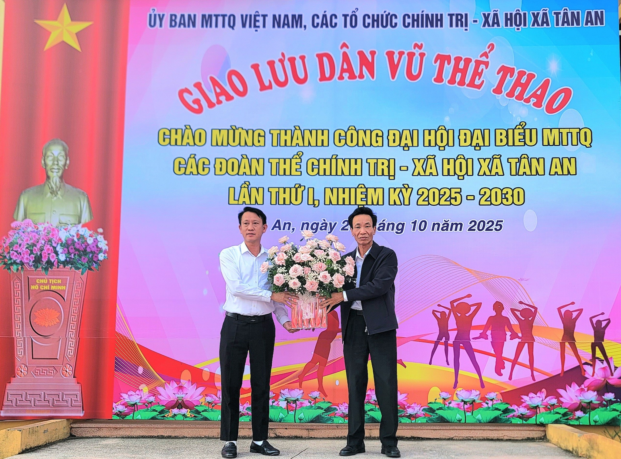 Đồng chí Nguyễn Gia Bảng – Bí thư Đảng ủy, Chủ tịch HĐND xã Tân An tặng hoa chúc mừngDự và động viên chương trình có đồng chí Nguyễn Gia Bảng – Bí thư Đảng ủy, Chủ tịch HĐND xã; các đồng chí trong Ban Thường vụ Đảng ủy, Thường trực HĐND, lãnh đạo UBND, Thường trực UBMTTQ Việt Nam xã, cùng lãnh đạo các phòng, ban, Bí thư các chi bộ, Trưởng thôn, Trưởng ban công tác Mặt trận và đông đảo cán bộ, hội viên, Nhân dân trên địa bàn.